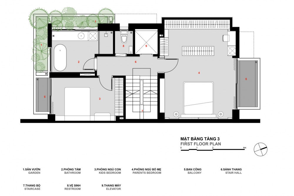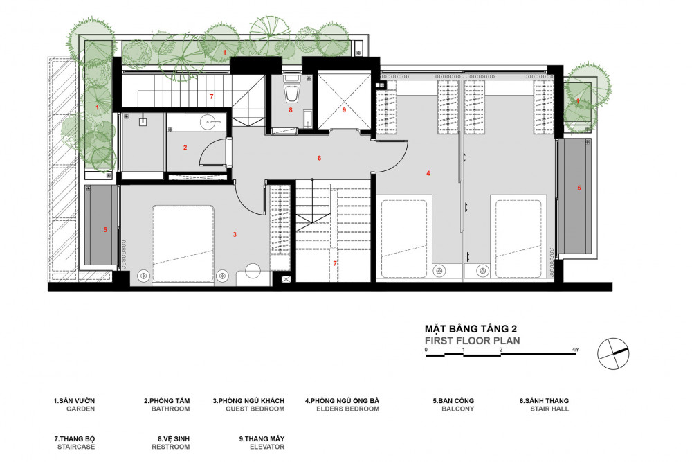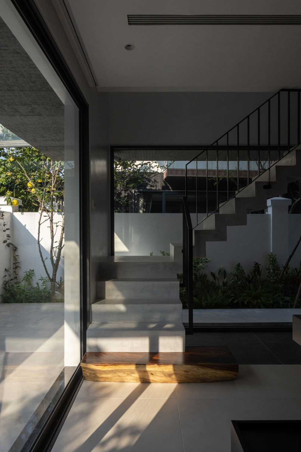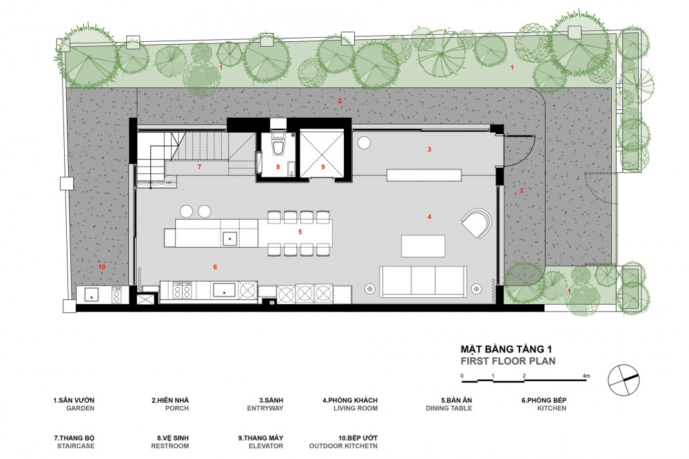 Với bài toán thiết kế cho gia đình ba thế hệ, mục tiêu là kiến tạo một không gian mở, hòa nhịp với thiên nhiên nhưng vẫn đảm bảo sự riêng tư cần thiết. Giải pháp then chốt là tái tổ chức giao thông theo trục dọc: thang bộ tầng một được chuyển về cuối nhà, giúp giải phóng đáng kể diện tích trung tâm, tạo nên chuỗi không gian khách — bếp — ăn liên thông và khoáng đạt. Từ tầng hai, thang được trả về vị trí giữa để đảm bảo sự riêng biệt và yên tĩnh cho các phòng ngủ.