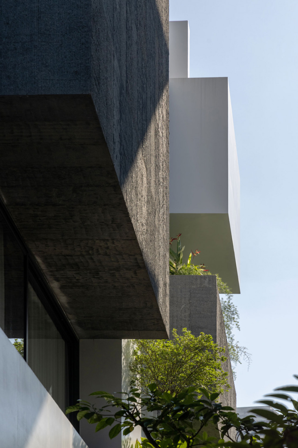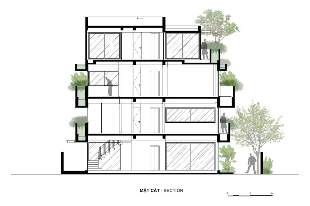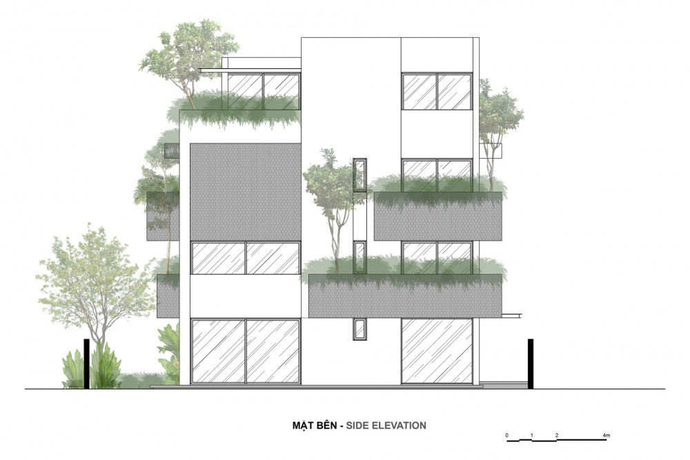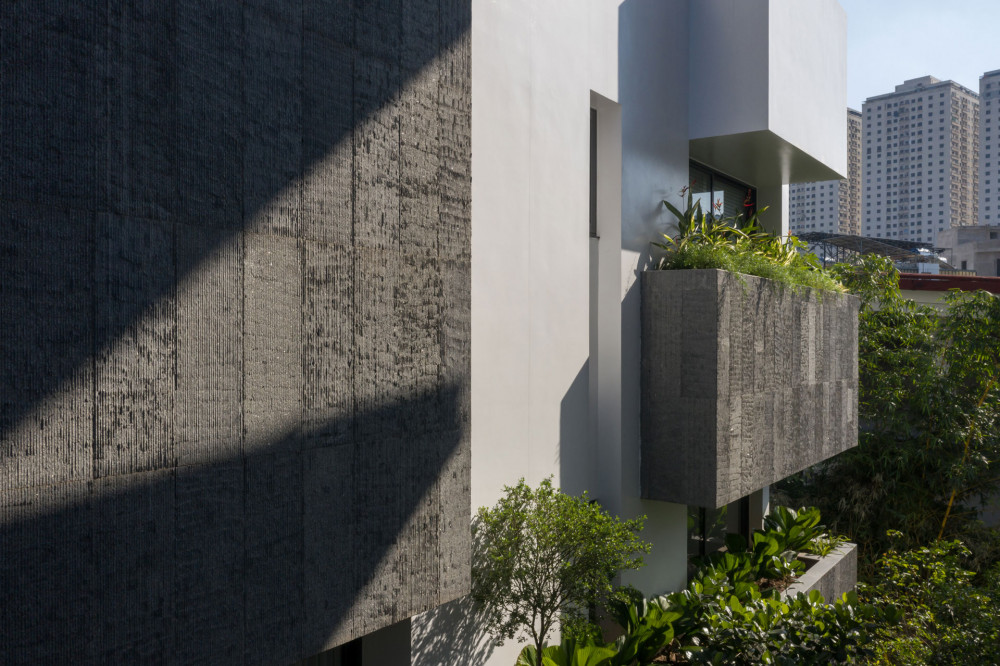 Về kiến trúc, mặt đứng công trình là sự kết hợp giữa các mảng kính lớn và bồn cây — đóng vai trò như những “lá phổi” tự nhiên. Hệ thống cây xanh đan xen này không chỉ làm mềm hình khối kiến trúc mà còn là vùng đệm tiết chế nhiệt năng, giúp luồng không khí và ánh sáng tự nhiên luôn được luân chuyển một cách dễ chịu quanh năm.