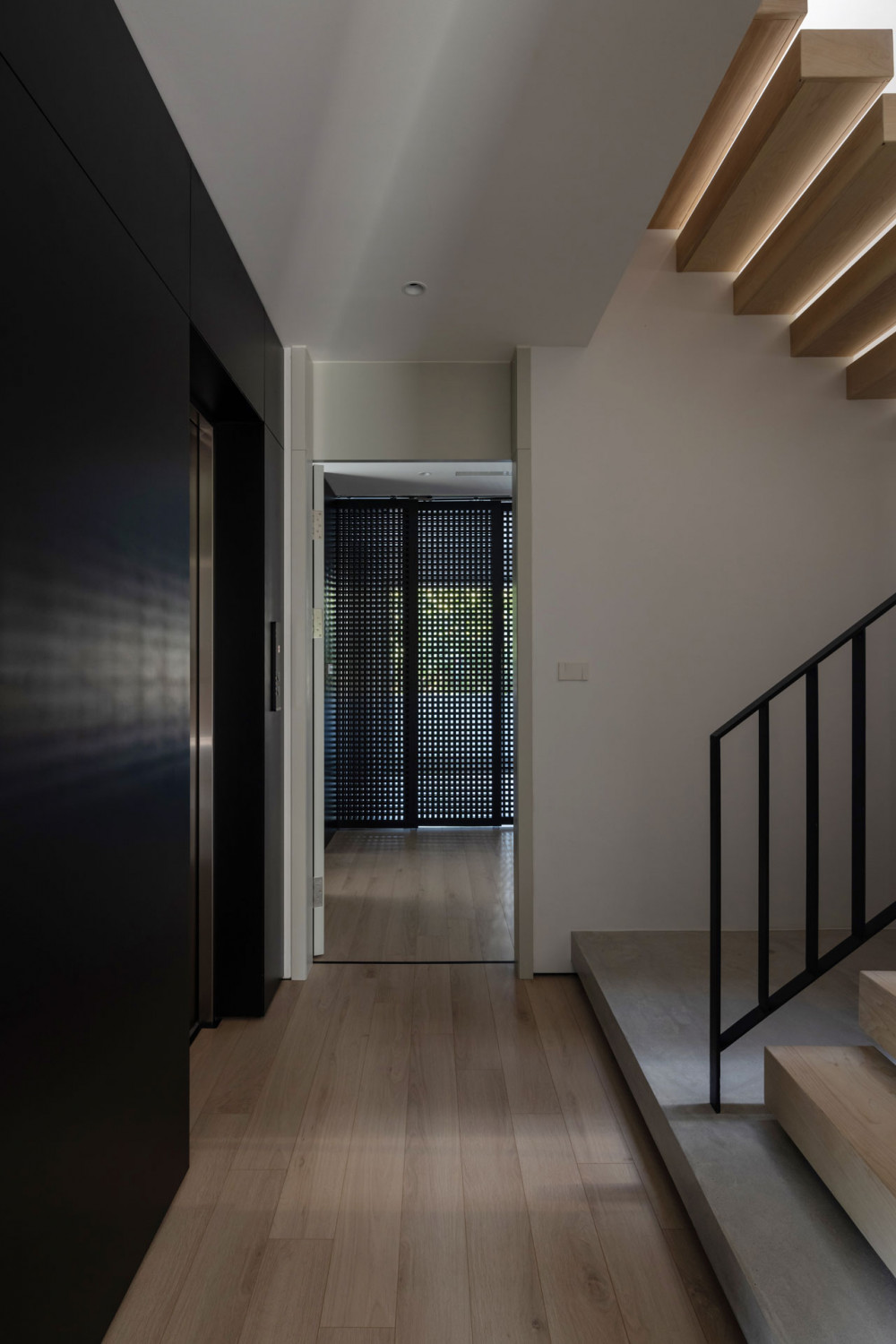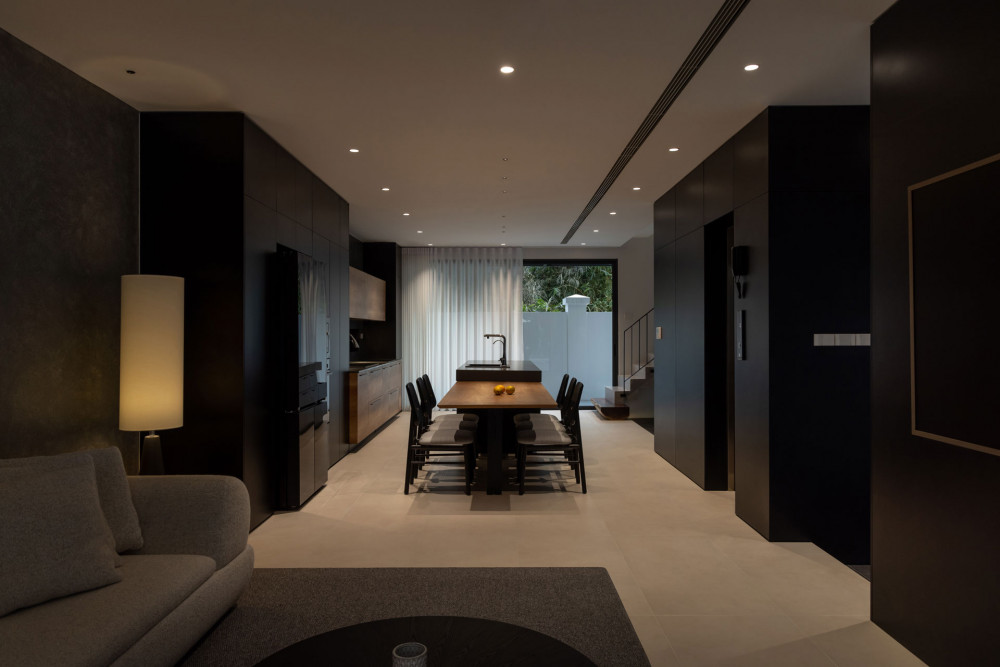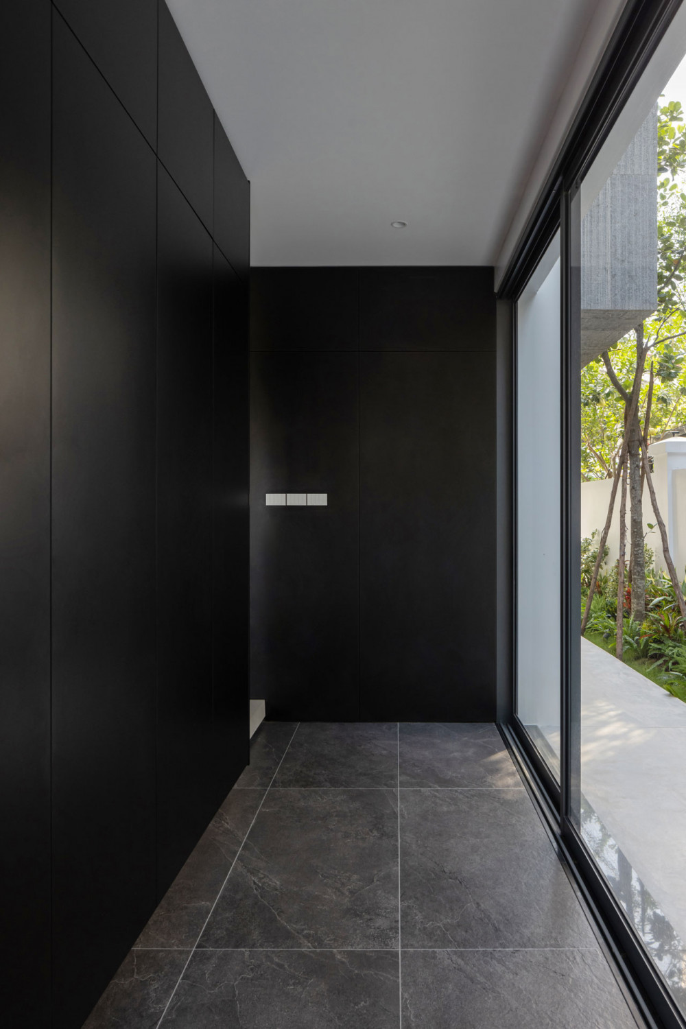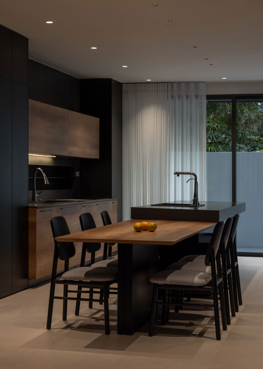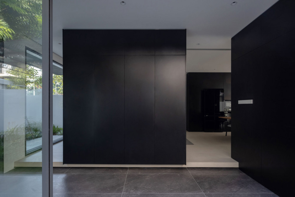 Không gian nội thất cũng nhất quán với triết lý đó: khúc triết, thông thoáng và mạch lạc. Các mảng màu đen được sử dụng có chủ đích, vừa là điểm tựa thị giác, vừa phản ánh cá tính mạnh mẽ của chủ nhà. Xen giữa những tông màu đối lập, sắc vân gỗ ấm mang đến sự cân bằng, tạo nên cảm giác tĩnh tại, ấm cúng mà không nặng nề. Mỗi chi tiết đều phục vụ công năng, nhưng đồng thời vẫn giữ được nhịp điệu và hơi thở của kiến trúc đương đại.