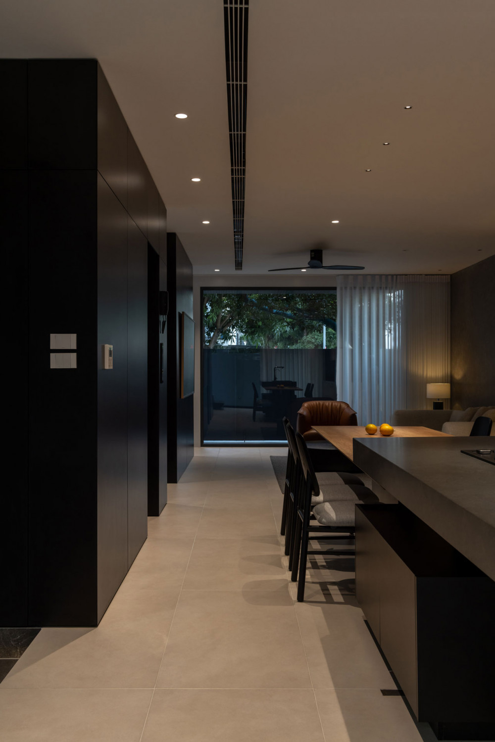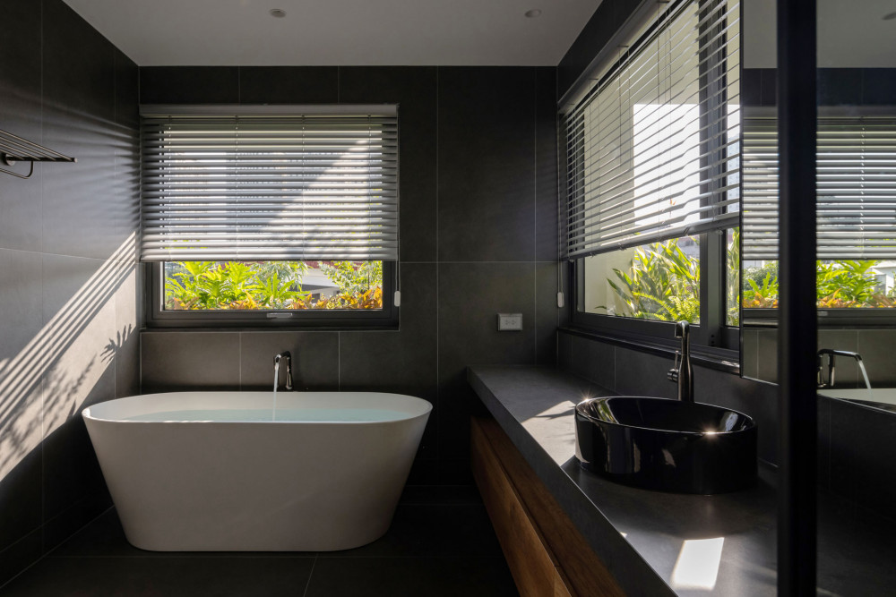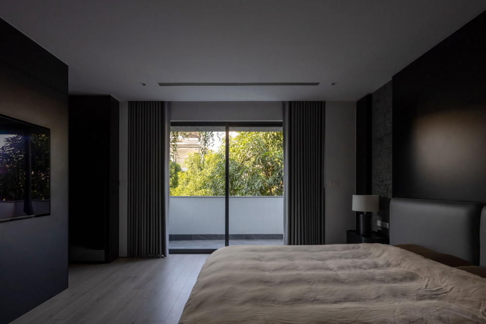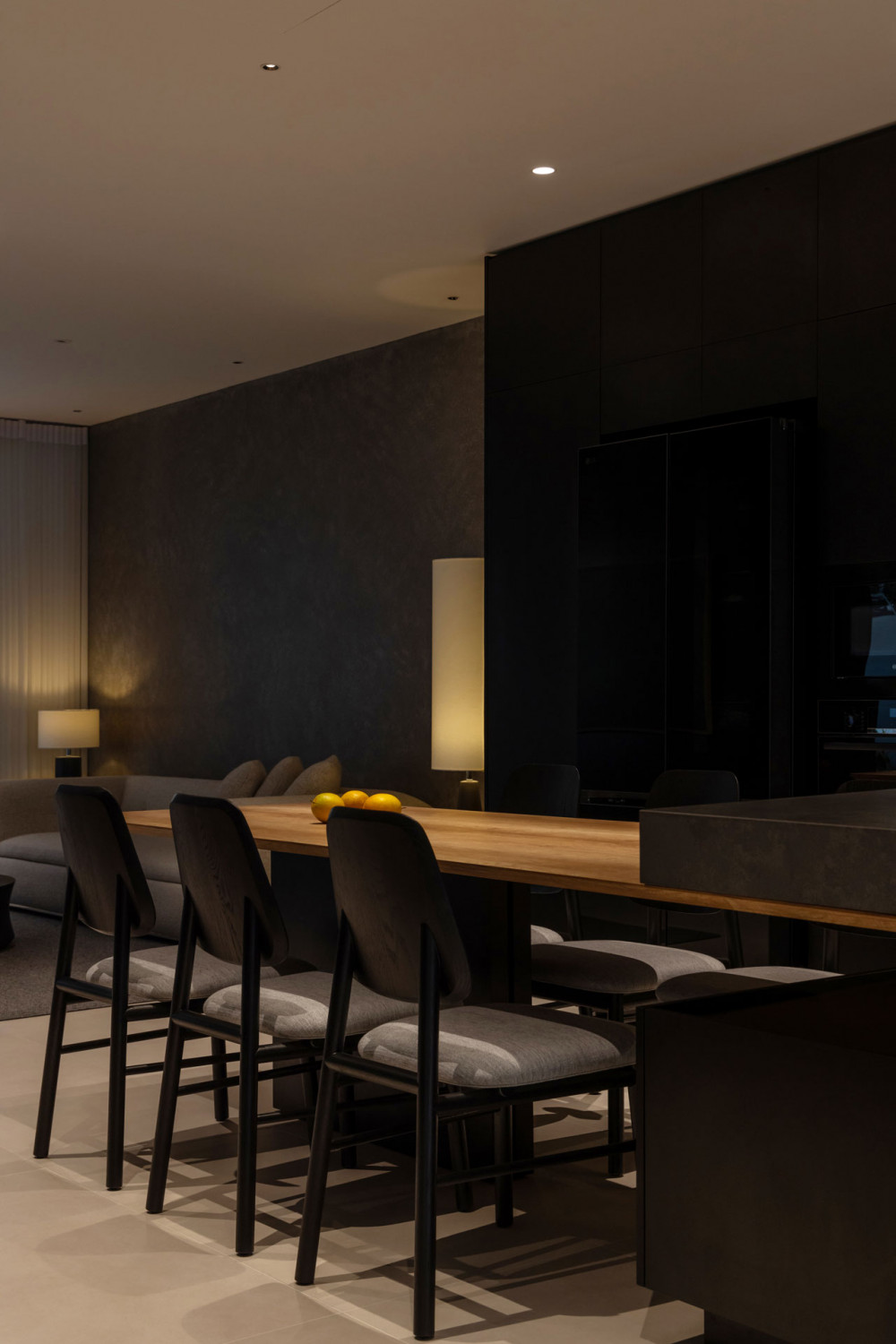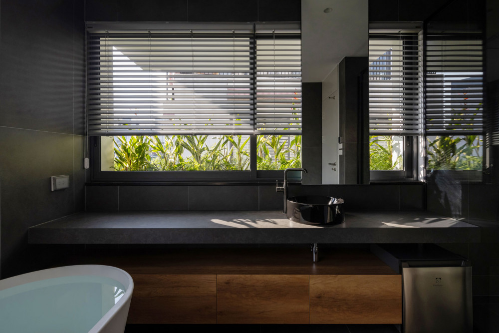 Không gian nội thất cũng nhất quán với triết lý đó: khúc triết, thông thoáng và mạch lạc. Các mảng màu đen được sử dụng có chủ đích, vừa là điểm tựa thị giác, vừa phản ánh cá tính mạnh mẽ của chủ nhà. Xen giữa những tông màu đối lập, sắc vân gỗ ấm mang đến sự cân bằng, tạo nên cảm giác tĩnh tại, ấm cúng mà không nặng nề. Mỗi chi tiết đều phục vụ công năng, nhưng đồng thời vẫn giữ được nhịp điệu và hơi thở của kiến trúc đương đại.