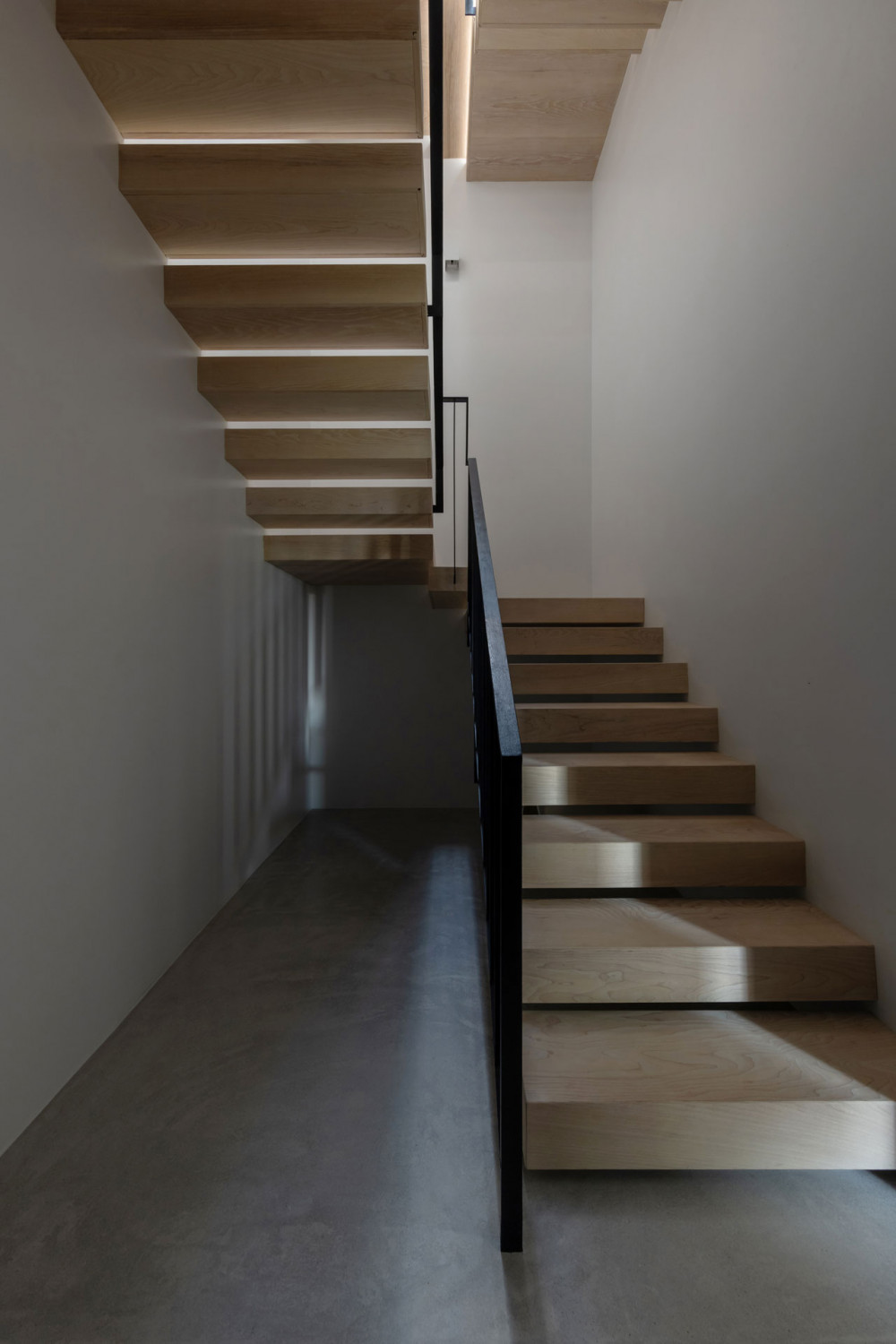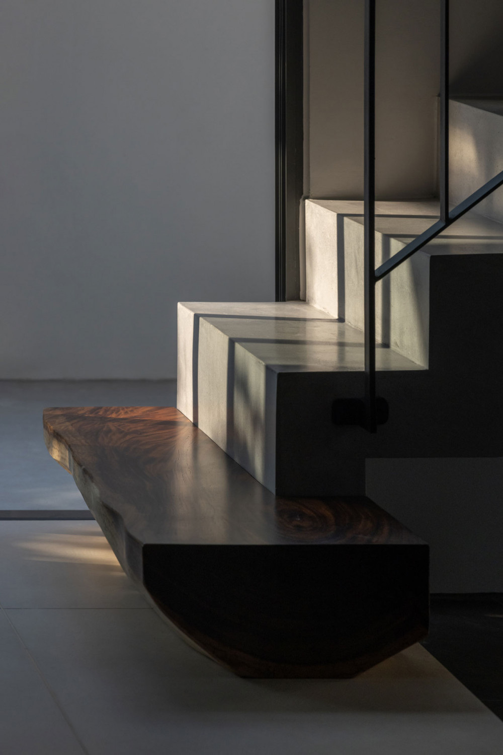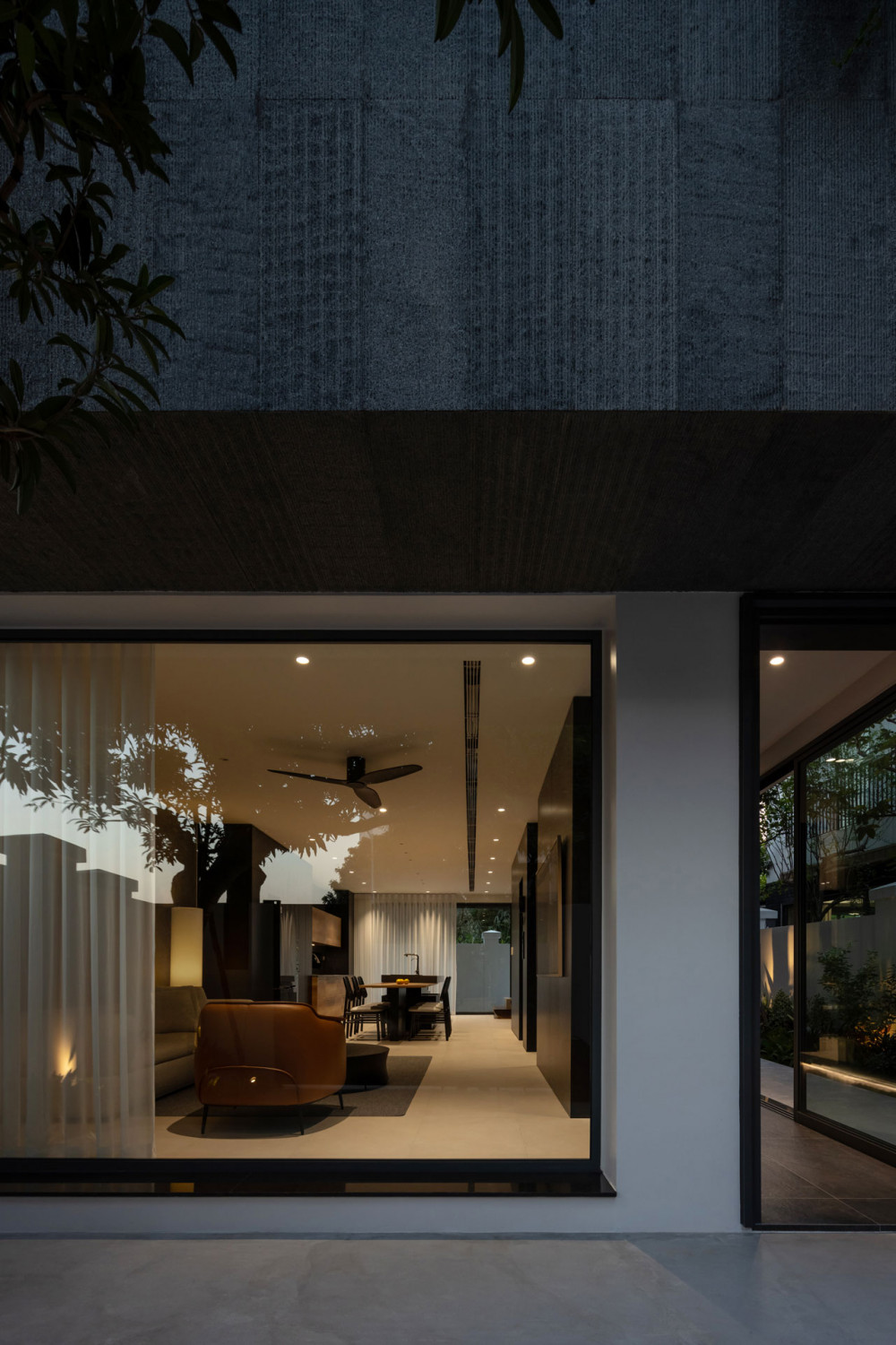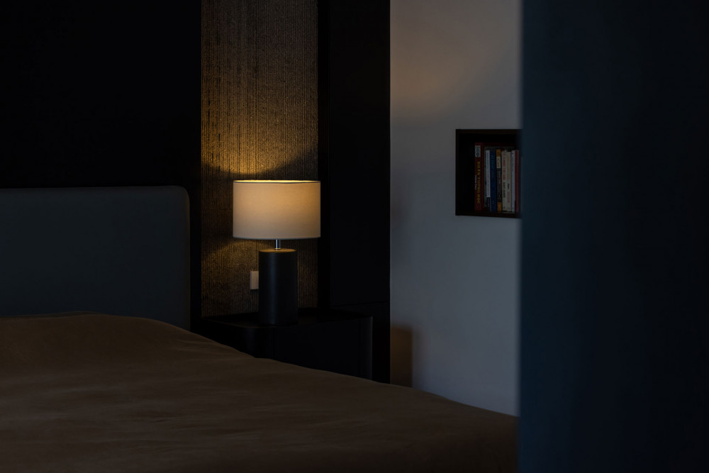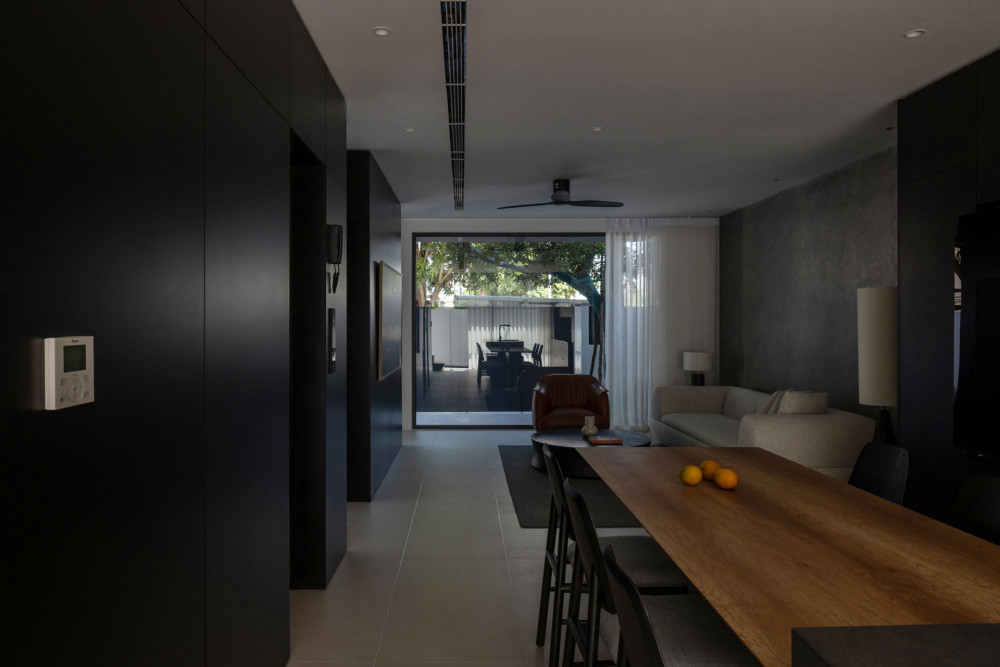 Không gian nội thất cũng nhất quán với triết lý đó: khúc triết, thông thoáng và mạch lạc. Các mảng màu đen được sử dụng có chủ đích, vừa là điểm tựa thị giác, vừa phản ánh cá tính mạnh mẽ của chủ nhà. Xen giữa những tông màu đối lập, sắc vân gỗ ấm mang đến sự cân bằng, tạo nên cảm giác tĩnh tại, ấm cúng mà không nặng nề. Mỗi chi tiết đều phục vụ công năng, nhưng đồng thời vẫn giữ được nhịp điệu và hơi thở của kiến trúc đương đại.